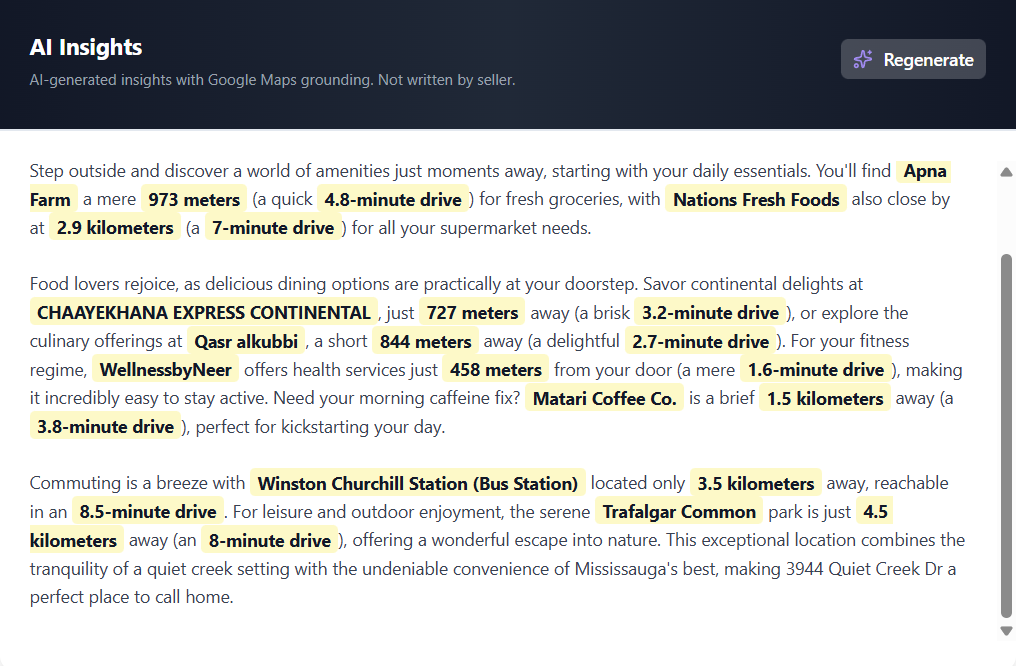 Our platform leverages Google's Gemini AI combined with Google Maps data to create rich, location-aware listing descriptions, automatic commute analysis, and interactive lifestyle maps for every listing.